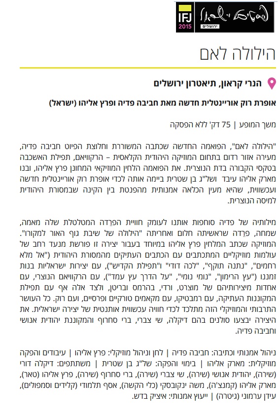 To implement t music as a bridge between different groups in Israel and between Jews and Arabs worldwide. This Memorial Festivity (Hillula) takes the form of an Oriental Jewish Rock-opera-come-wake celebration.
