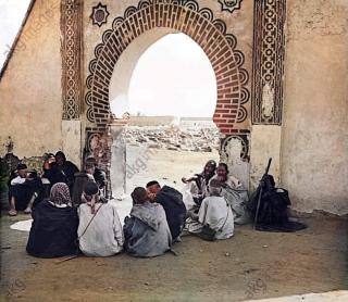 C’est la haie d’honneur des morts, chargée de la chronique nécrologique de Marrakech. Dans l’attente d’un visiteur, d’un cortège mortuaire, d’une libation funéraire. Ils ne franchissent pas la porte, ils attendraient la convocation au quorum du kaddish. Ils sont peut-être aveugles, peut-être sourds, peut-être diminués. Ce sont les derniers gardiens d’un exil qui échouait au cimetière d’où l’on gagnait le ciel. L’un a le voile à pois des sages marocains, l’autre un capuchon sur le visage, les autres des calottes. On n’entrait pas sans leur verser une aumône, on n’en sortait pas sans verser une aumône. Ils se postaient tous les jours devant la mort. Dans l’attente de rallier la légende de cette photo.