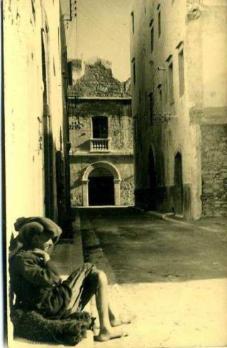 Je ne sais par quel concours de circonstances le personnage assis contre le mur s'est trouvé là quand le photographe a pris la maison du consulat du Danemark au fond de la rue, mais je crois savoir qui il est. J'ai cherché dans mes souvenirs et mes lectures à qui le rattacher et je peux d'ores et déjà vous assurer que ce pauvre hère finira dans le Musée Andersen que je demande instamment aux autorités danoises d'aménager dans leur consulat historique que le gouvernement (en voie de formation) de la principauté de Mogador leur restitue contre un dirham symbolique. Ils ne le créeraient, eux aussi, que pour réparer leurs torts coloniaux à son égard (quoique de toutes les puissances européennes, les Danois aient été plus malmenés par les Marocains que le contraire et n'aient d'autre tort que de m'avoir arraché des larmes à la lecture de la Petite fille aux allumettes).