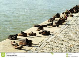 Dans les boyaux du complexe, un minuscule musée, vestige peut-être d’un bain rituel, consacré à la Shoah, où l’on ne descend pas sans murmurer : « Des abîmes, j’ai appelé Dieu », sans rien d’autre qu’une étagère sur laquelle s’accumulent des pièces de monnaie en guise de pierres mortuaires. Ce serait plutôt là que Dieu résiderait, parmi les miséreux, les victimes et les touristes perdus, en accroc dans l’être et en raccord dans l’âme, humble et accablé, se composant de grisaille perlée de nuances de lumière et d’interstices de sens, en absence purulente dans ma vie. Les nazis conduisaient leurs victimes sur les berges du Danube, leur ordonnaient de se dévêtir, les abattaient et poussaient leurs dépouilles dans le fleuve. Sur les berges, des milliers de chaussures. C’était l’opération : « Le Danube rouge ».