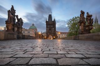 De tous les ponts qui enjambent la Vlatava, le pont Charles est sans conteste le plus impressionnant. Un pont piétonnier reliant deux monuments historiques et encadré, des deux côtés, par des statues, plus impressionnantes les unes que les autres, qu'on prendrait volontiers pour les vestiges d'une production sculpturale à la Cecil B. de Mill si on ne les savait de pierre et de dévotion. Des saints, des prédicateurs, des chevaliers, des rois ; des papes, des vicaires, des vierges. Les statues brandissent des croix, des lances, des glaives. Elles portent un enfant dans les bras ou sur les épaules. Elles forment comme une haie christique sur le chemin qui relie le Procès au Château. Mais les touristes sont de peluche, ils n'attendent de révélation ni de l’un ni de l’autre. Ils pensent que l’un ne rime à rien alors qu’il leur est intenté pour passer sans trébucher et que l’autre ne recèle que le siège de l’incoercible bureaucratie qui régente nos vies alors qu’il recèle des abîmes de perplexité. Prague est la clinquante vitrine de l’atelier d’alchimie de son illustre et indépassable Golem littéraire.